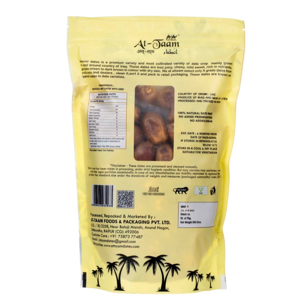 Ameer Dates is Premium Variety and most cultivated variety of date crop mainly grown in and around country of Iraq. These dates are less juicy, chewy, mild sweet , rich in nutrients, golden brown to dark brown in color with dry skin. We at attaam select only A grade dates from cultivars and dealers, clean it, sort it and pack in retail packaging. These dates are known as zahidi dates in dates varieties.