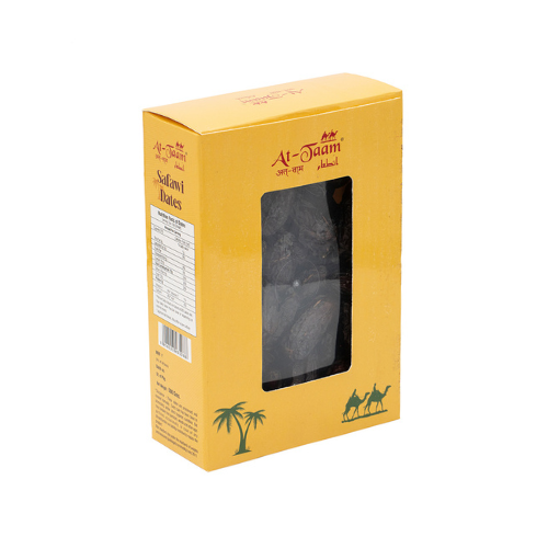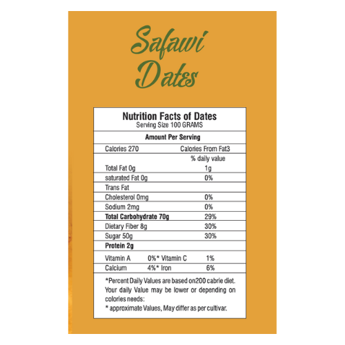 Safawi dates are a premium variety of dates primarily grown in the Al-Madina region of Saudi Arabia. They are known for their: Appearance: Deep black color, oblong shape, and medium size. Texture: Soft and chewy. Flavor: Sweet with subtle nutty undertones.