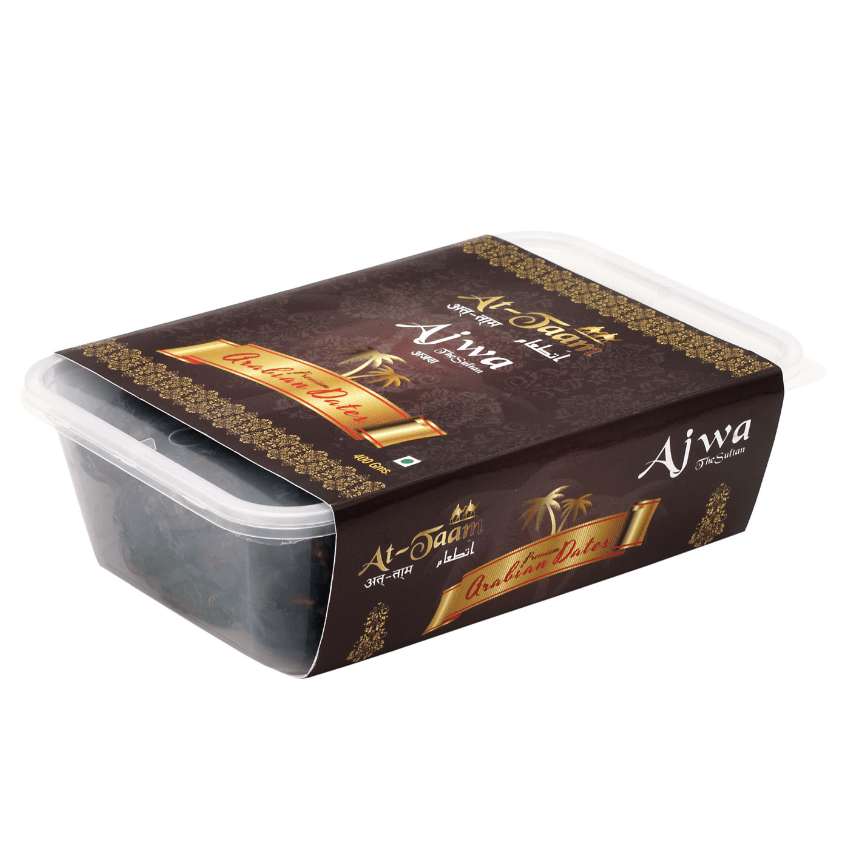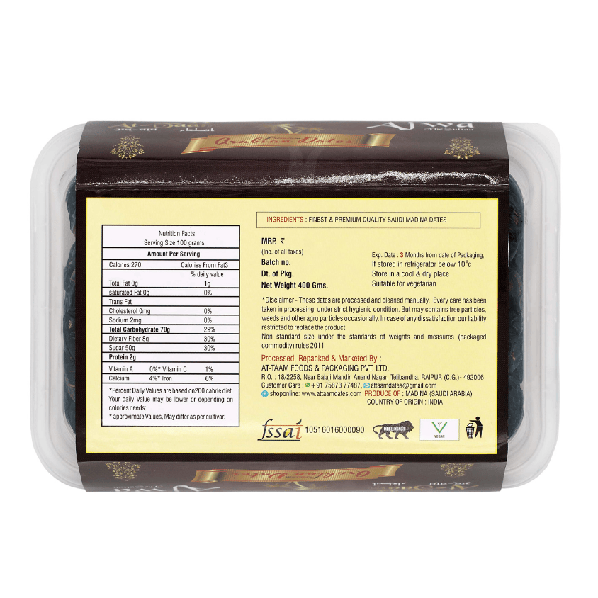 AJWA The Sultan is the most Prestigious Dates in the Dates World of Arabia . These dates are grown in and around holy city of Madina and are very respected and important date crop in Muslim and Arab world. These dates are very rich in their natural properties and are one of the costliest dates. We carefully select original Ajwa dates, clean and process it. AJWA The Sultan contains Ajwa dates (with seed), free from Bugs, forest particles, rodents and road dust etc. We at At-Taam Carefully select only A grade Ajwa dates and with utmost care and by following all the rules and regulation regarding safety and hygiene we process and pack it. These dates are stored in required temperature for freshness, to serve you the best.