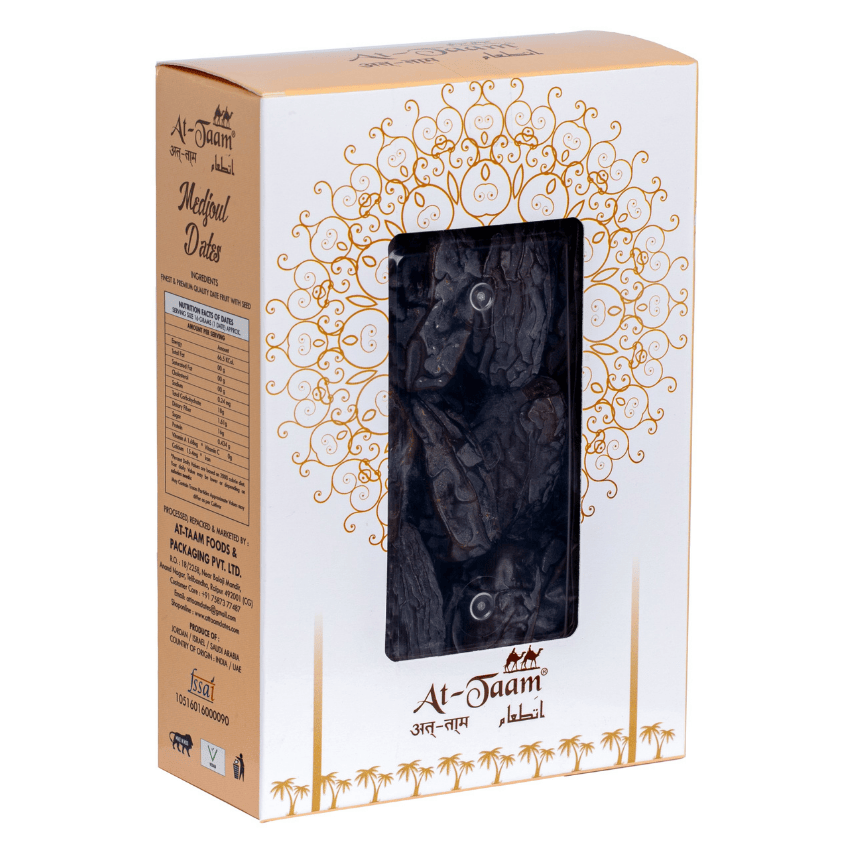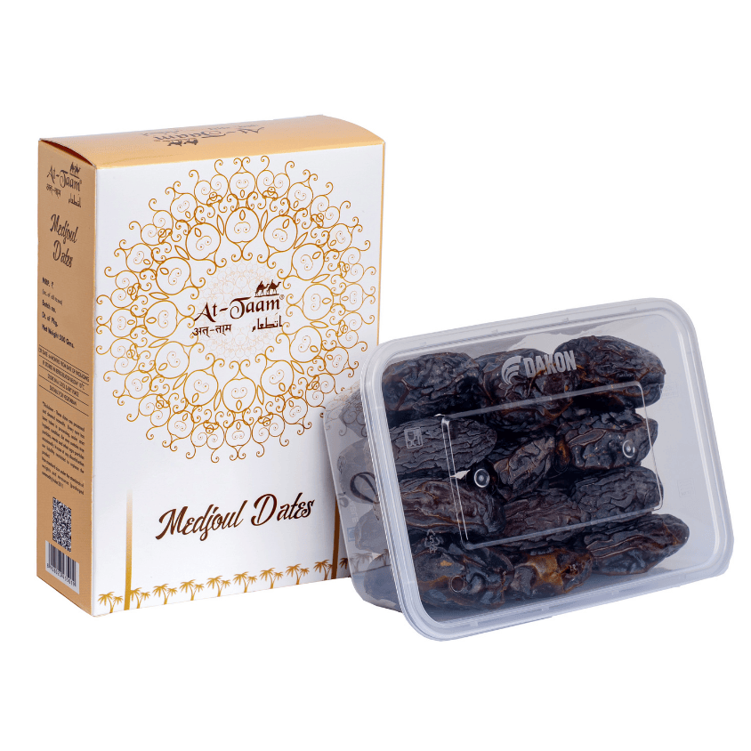 In dates world of Arabia Majdool dates commonly known as Medjoul dates enjoys position of King of Dates . These dates are big in size, very fleshy, juicy and sweet in taste. The colour of these dates are brown to dark brown. These dates are grown in mainly 2 countries i.e Israel and Jordan. We at At-Taam Carefully select only A grade Medjoul dates and with utmost care and by following all the rules and regulation regarding safety and hygiene, are packed in food grade microwavable containers. These dates are stored in farm land, during shipment and in our storage facility in required temperature for freshness, to serve you the best.
